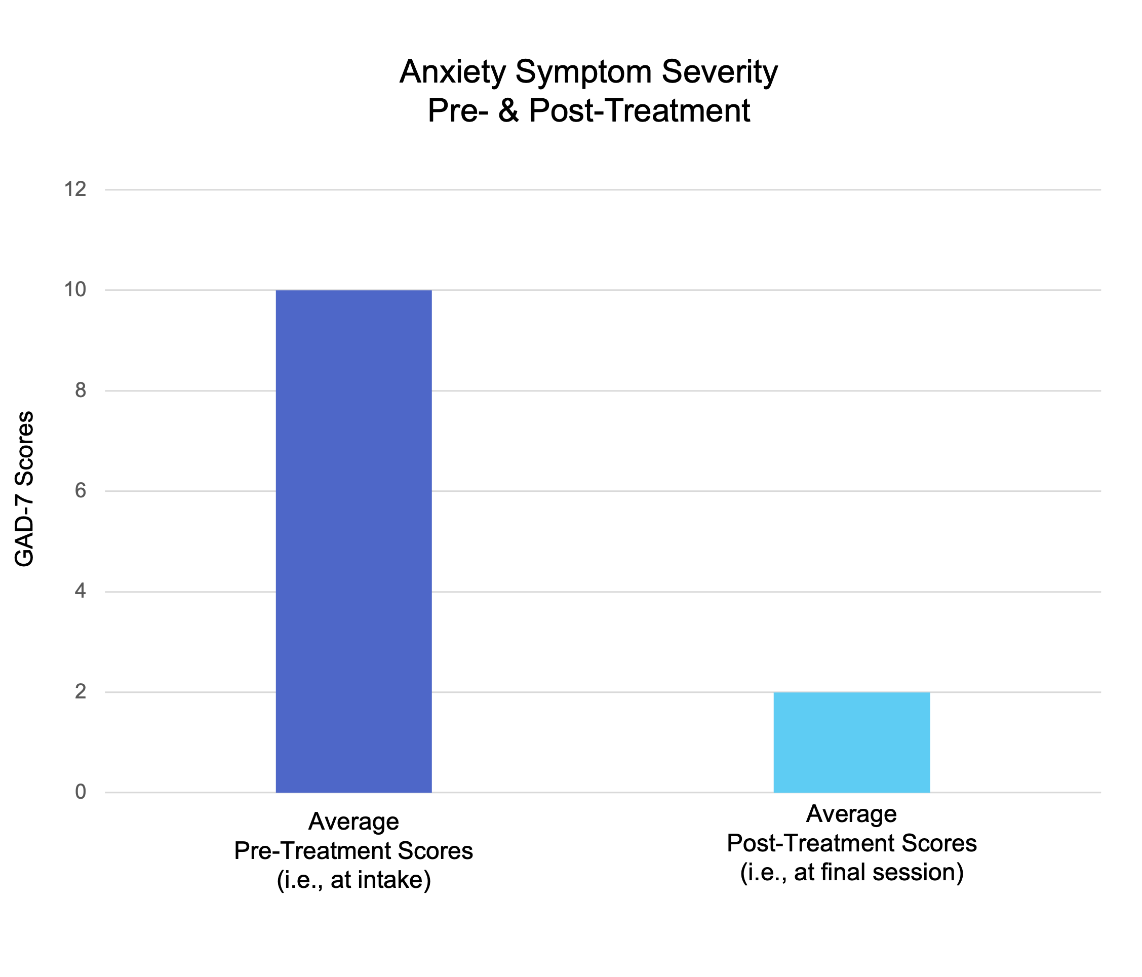 Note: the graph displays results for Generalized Anxiety Disorder symptom severity for ease; other anxiety disorders (e.g., Social Anxiety Disorder, Panic Disorder, Specific Phobia) treated in my practice show similar patterns of symptom reductions.